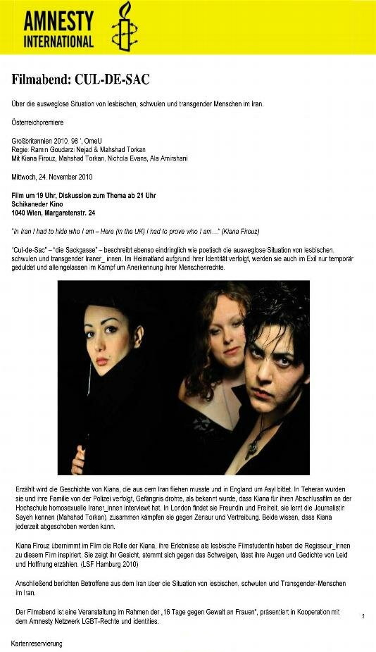 Cul-de-sac has been recognised by many International film festivals for outstanding contribution for raising awareness in human right issues Film Festival Hamburg 30 Sept– 09 Oct 2010 Refugee Week Film Festival Scotland 19th June 2010 Florence Queer Film Festival 26Nov-2 Dec